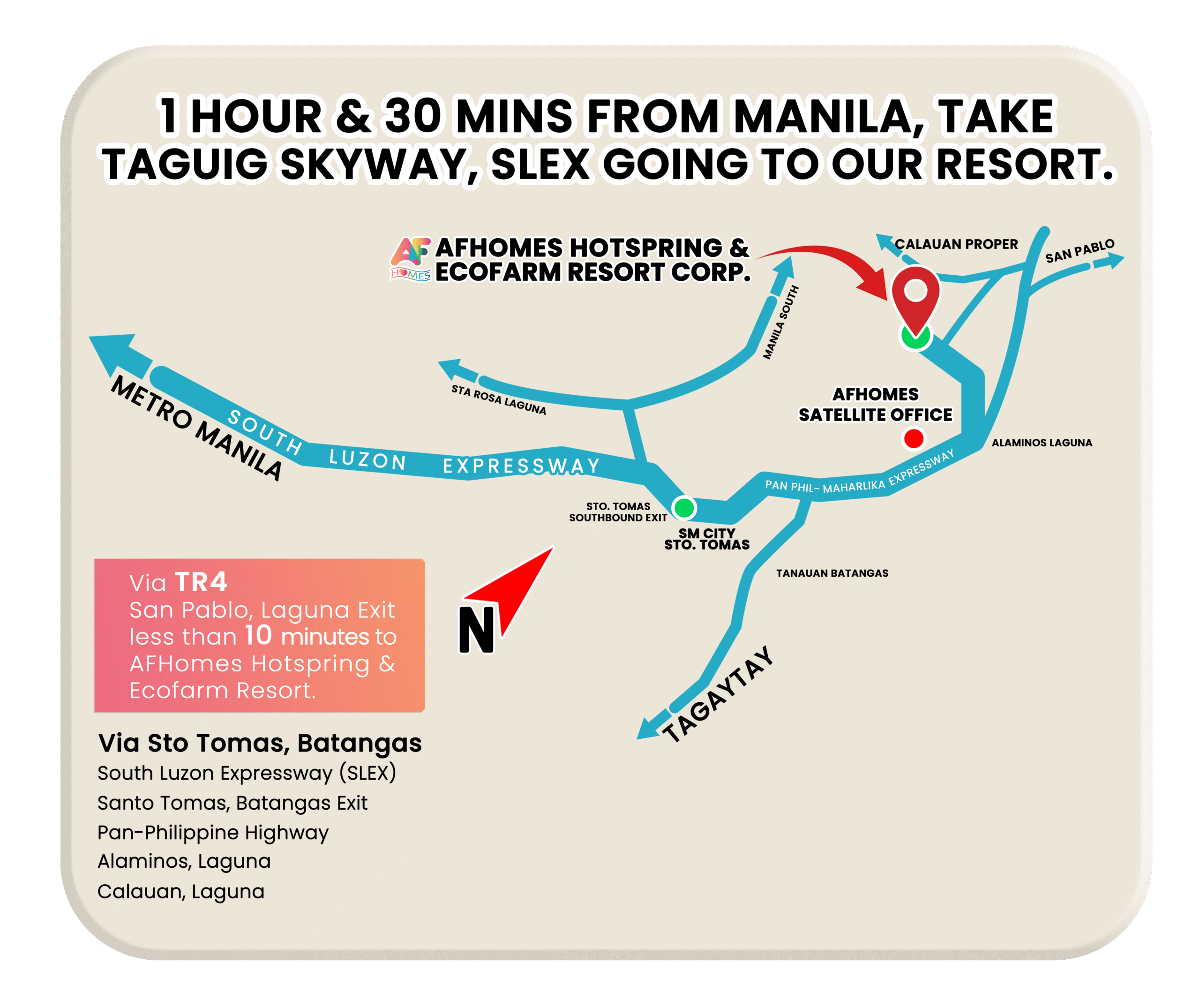 The resort is located at Guevarra Limao 3rd. Dist, Calauan, Laguna, Region IV-A (CALABARZON), 4012, nestled in a scenic area that offers tranquility and natural beauty. Only 1hr and 30mins travel from SLEX Taguig Skyway going to our resort, and Only 40mins time travel from SLEX Taguig Skyway going to our resort once the Alaminos TR4 exit is fully accessible.