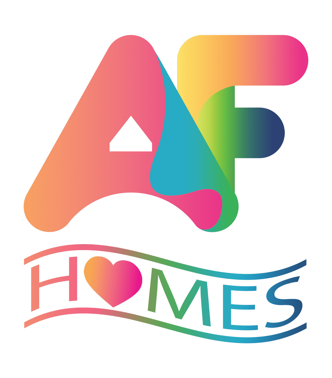 The AFhomes logo features a vibrant, contemporary design that embodies the warmth and vitality of our brand. The letters "AF" are crafted in a fluid, rounded typeface with seamless gradient transitions flowing through coral pink, turquoise blue, sunny yellow-orange, and fresh green tones. Below, the word "HOMES" is presented with a distinctive heart symbol replacing the letter "O," emphasizing our commitment to heartfelt hospitality.